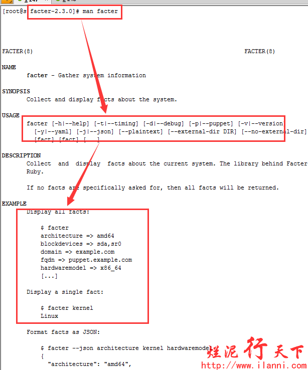 如果想查看facter详细帮助信息,我们也可以man下facter。如下: