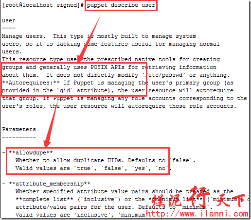 如果想查看user的资源,我们还是继续使用puppet describe user命令进行查看。如下:
