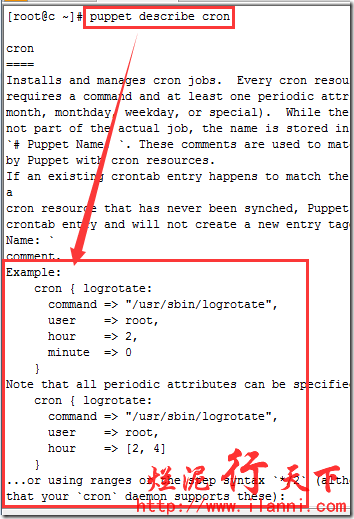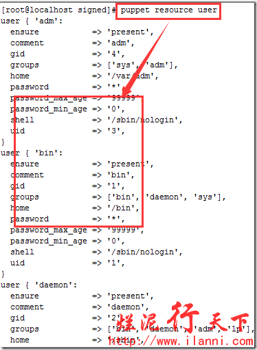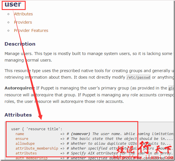 通过上图,我们可以看到puppet已经给出了user使用的例子,我们只需要按照这个例子进行操作即可。
