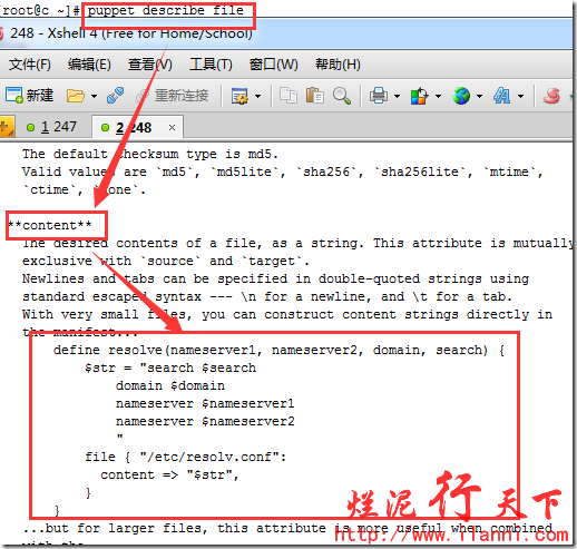 注意:如果puppet describe帮助中没有该资源在site.pp站点中的使用详情,我们可以去到puppet resource中进行查看。