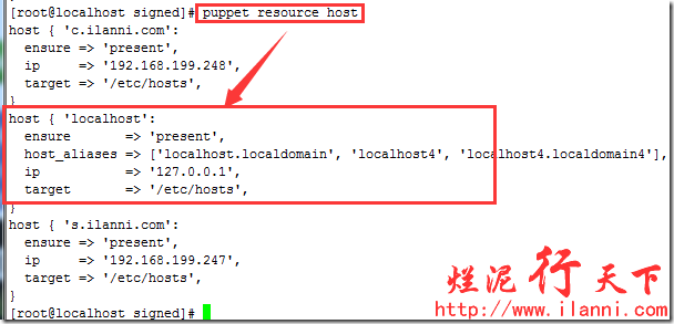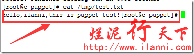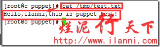 以上命令表示在puppet资源配置文件冲创建一个默认节点,使用file资源,在agent端的/tmp/目录下创建test.txt,内容为:Hello,ilanni,this is puppet test!\n
