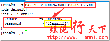 这条命令的作用是,创建用户ilanni。其中ensure后边的字段为present表示创建ilanni这个用户,如果ensure后边的字段为absent表示删除ilanni这个用户。