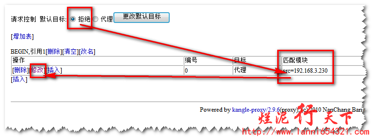 我们对这些问题要一个一个的解决,首先来解决限制特定IP使用代理的问题,登陆后台,我们要在“默认目标”中选择“拒绝”,如下图: