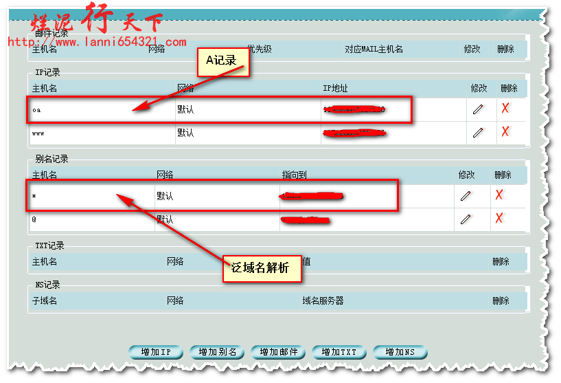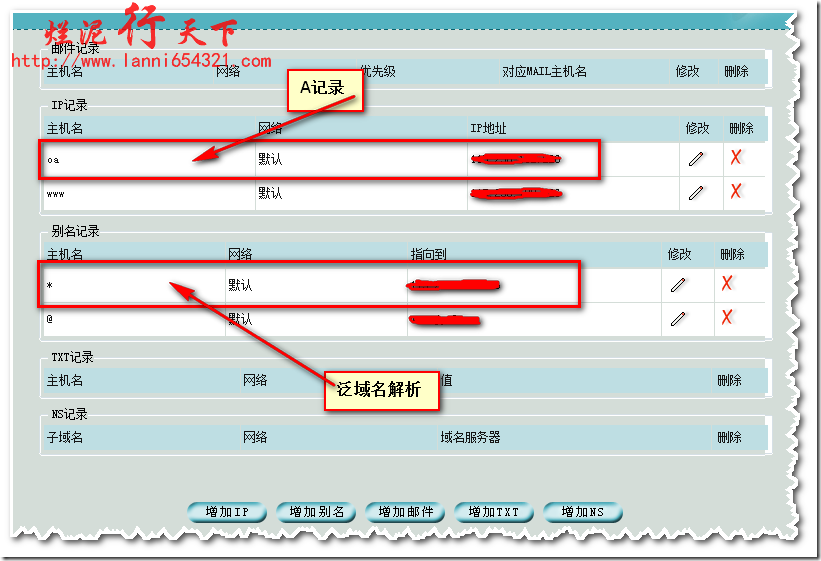 因为我这个网站和系统使用的是同一个域名,只是是一级和二级的关系而已。所以我们要使用泛域名解析和A记录了。如下图示: