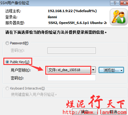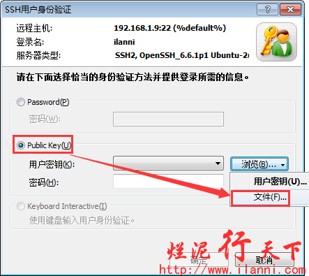 我们不选择Password选项,要选择Public Key选项。然后选择“浏览”–“文件”,如下: