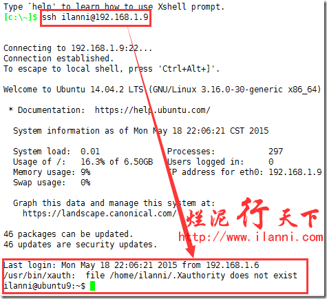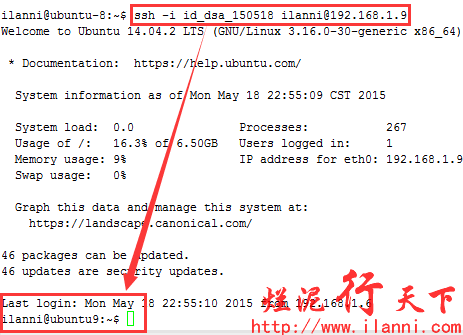 再次使用ssh -i id_dsa_150518 ilanni@192.168.1.9命令进行连接,如下: