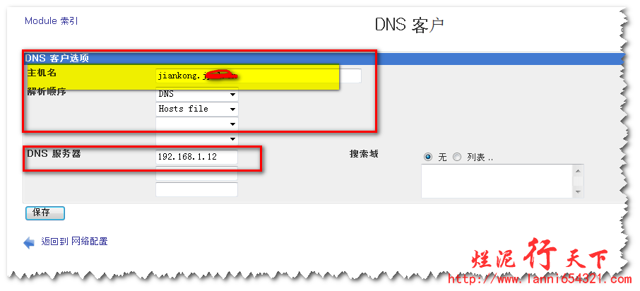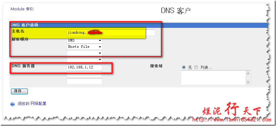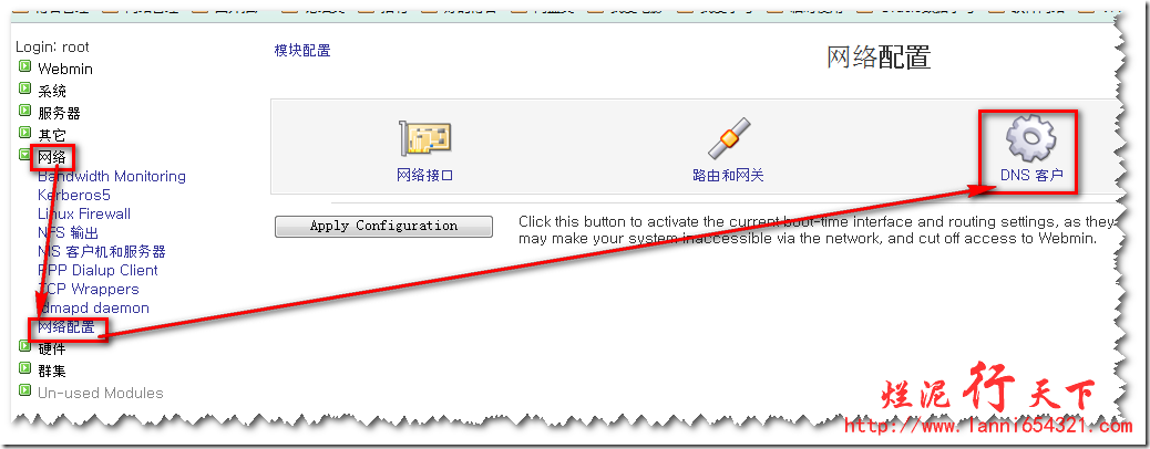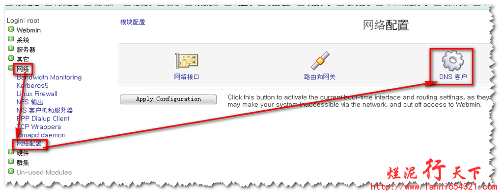 首先、登陆webmin的后台,点击“网络”→“网络配置”→“DNS客户”,如下图: