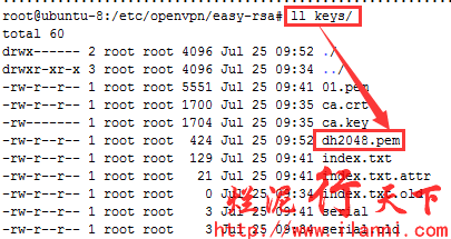 以上操作完毕后,把vpnilanni.crt、vpnilanni.key、dh2048.pem复制到/etc/openvpn/目录下,如下: