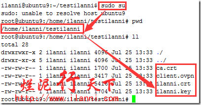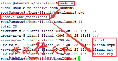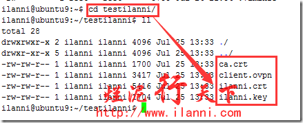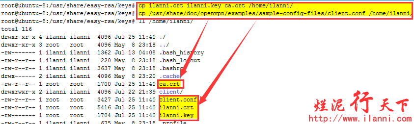 先把这几个文件复制到/home/ilanni/目录下,然后再把openvpn客户端的配置文件模版也复制到/home/ilanni/目录下。如下: