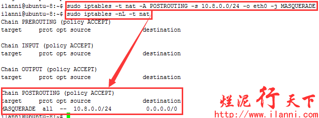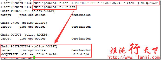 现在我们开始配置IPtables规则,我们需要做的就是把所有来自10.8.0.1/24网段的请求,全部通过openvpn服务器的eth0网卡转发出去,也就是我们平时所说的IPtables的NAT规则。
