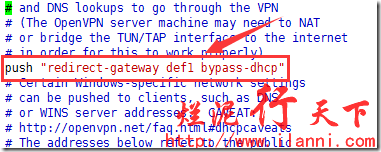 在openvpn配置中,我们只需要在openvpn服务器的server.conf配置中,开启push “redirect-gateway def1 bypass-dhcp”项即可。如下: