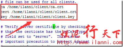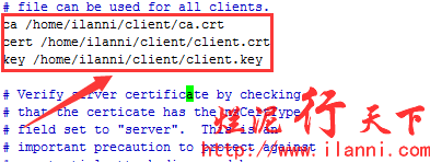 但是有一点需要特别注意,就是openvpn客户端的配置文件中有关从CA证书、客户端的证书以及客户端密钥文件,一定要写成绝对路径,而不是相对路径,如下: